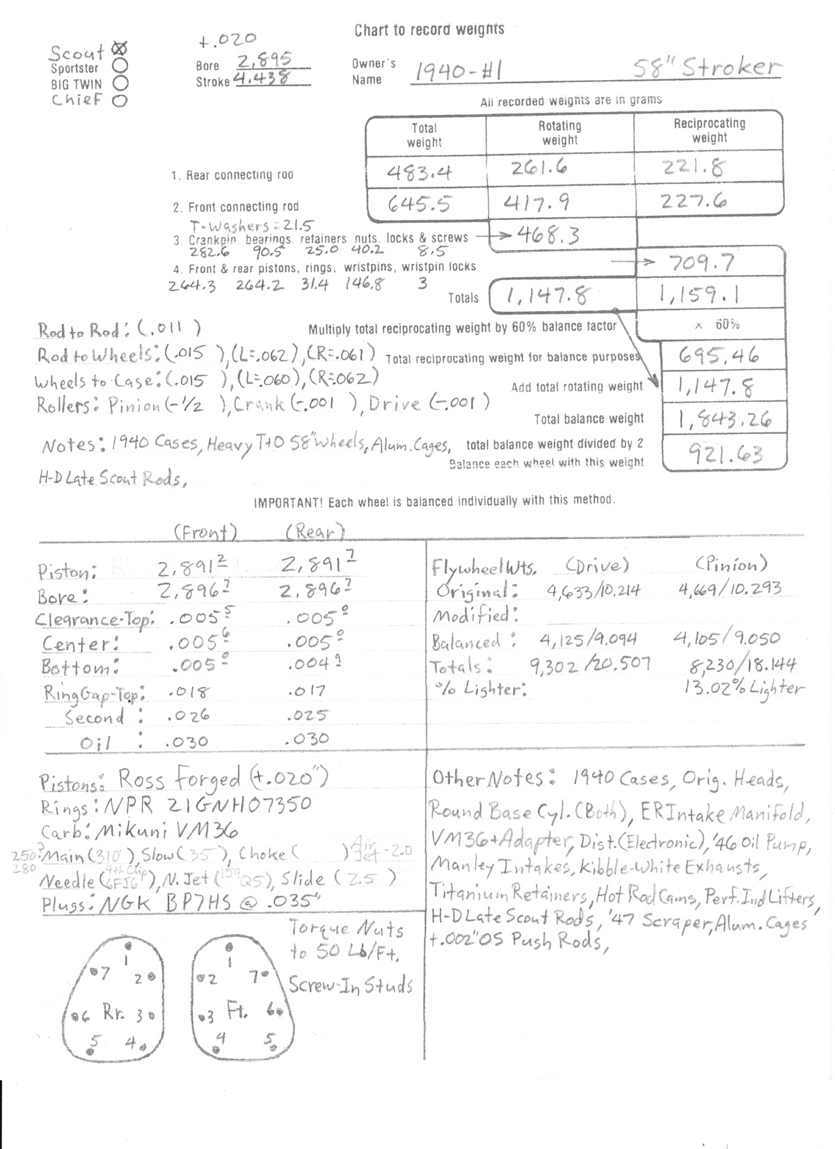 Here are (3) nearly identical Scout 58" Stroker motors. They are high-performance, yet fully streetable. I have built a few of these that have put on many thousands of miles, and still run strong. They don't leak, smoke, rattle, or get hot. These motors benefit from the many years of Land Speed racing Indian Scouts at Bonneville (successfully!). Every time I raced, and set records, I would do complete tear-down on the motors, and then do a forensic study to look for wear, so I could adjust the clearance specs to see if I see an improvement. I did at least (14) re-builds, and finally was satisfied with my wear patterns everywhere. These motors use all these final specs, and below, you can see a comprehensive spec sheet for each motor (Blue-Printed).
