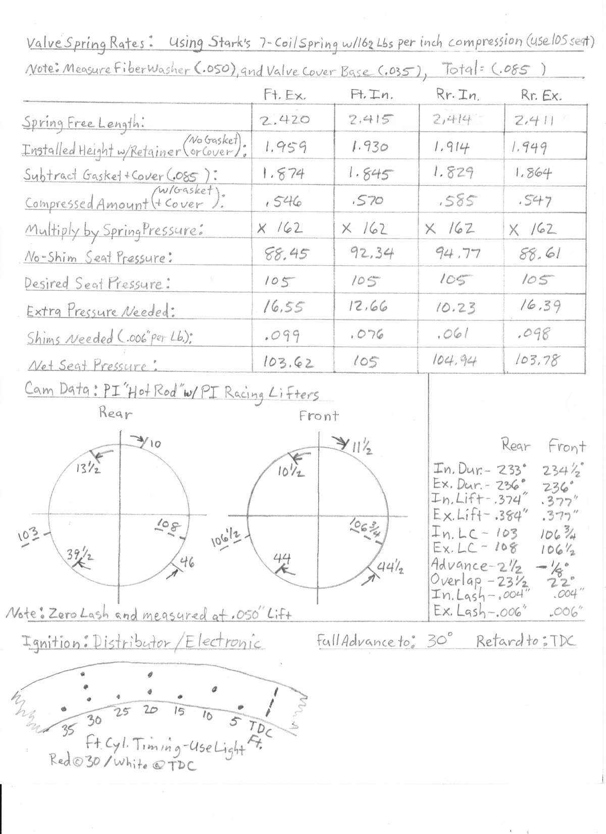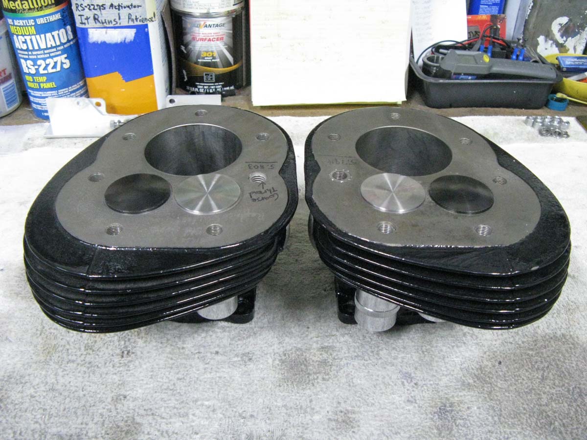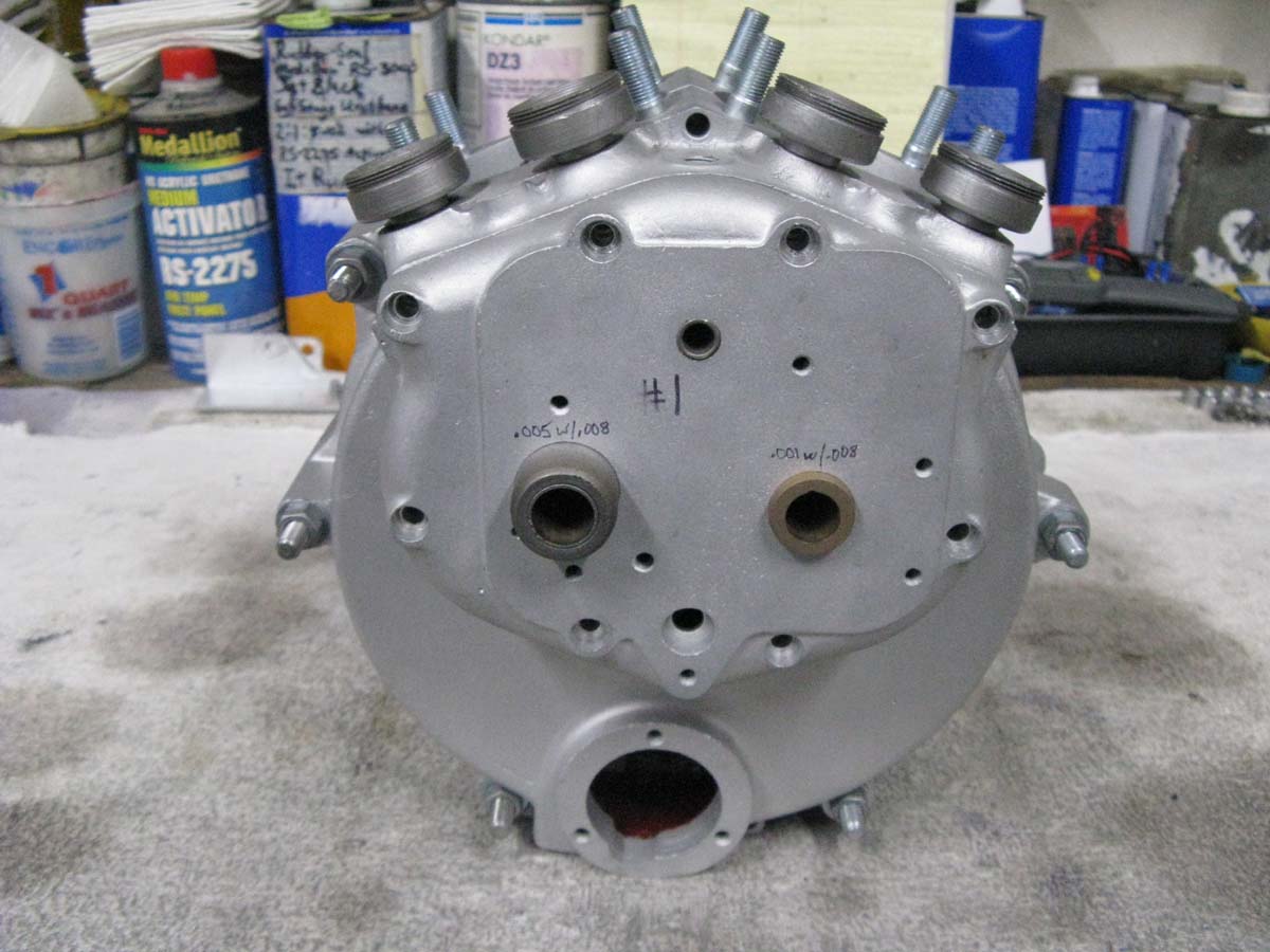 The cylinders were good rebuildable cores, that I went through to as new "Blue-Printed" spec. I did sleeves where needed, as well as new valve seats where needed. I did new guides, and honed to fit the valve stems. I added Teflon seals to the intake guides. Then I did "5-angle" valve jobs. The bores are honed for a .006" bore to piston skirt clearance, and the pistons have a robust deisel skirt coating for long life. They have special 7-coil valve springs of my design for no coil-bind, and more tension. I installed my fiber washers, and shim kits for optimum spring pressure. They all have my Titanium light Retainers, and new keepers. They also have new chrome valve covers. The intake valves are Manley extreme duty stainless steel, and the exhausts are Kibble-White "Black Diamond" from Gary Stark.