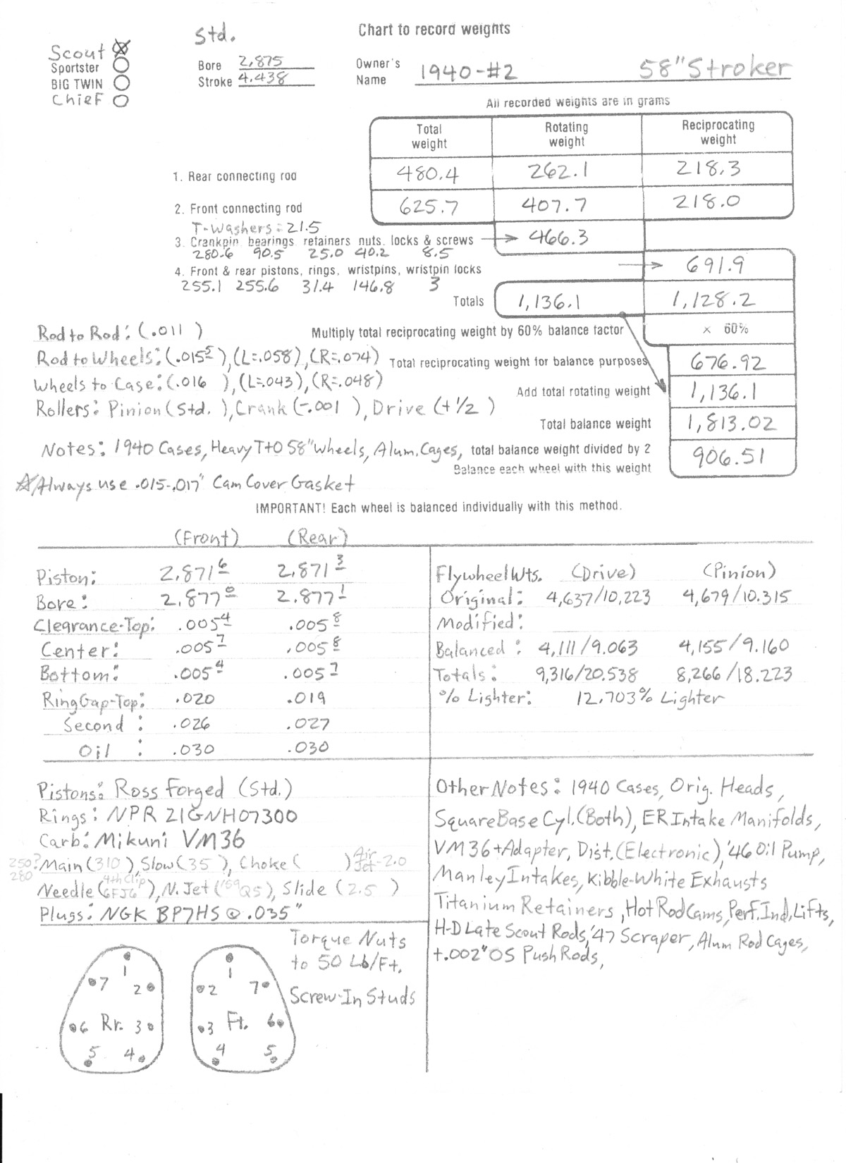 Here are (3) nearly identical Scout 58" Stroker motors. They are high-performance, yet fully streetable. I have built a few of these that have put on many thousands of miles, and still run strong. They don't leak, smoke, rattle, or get hot. These motors benefit from the many years of Land Speed racing Indian Scouts at Bonneville (successfully!). Every time I raced, and set records, I would do complete tear-down on the motors, and then do a forensic study to look for wear, so I could adjust the clearance specs to see if I see an improvement. I did at least (14) re-builds, and finally was satisfied with my wear patterns everywhere. These motors use all these final specs, and below, you can see a comprehensive spec sheet for each motor (Blue-Printed).