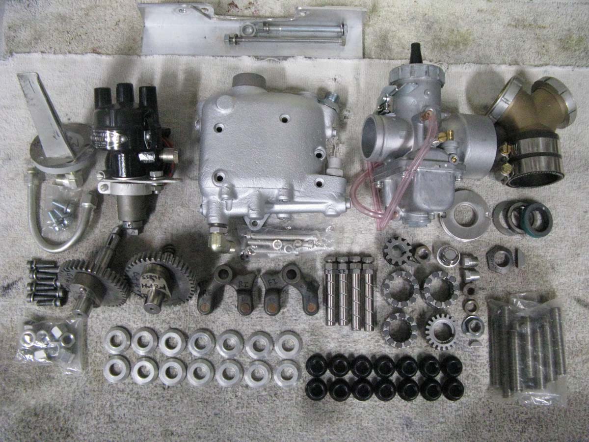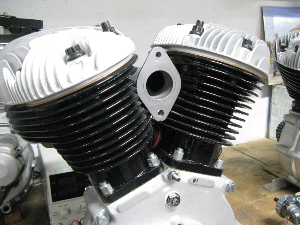 The cylinders were good rebuildable cores, that I went through to as new "Blue-Printed" spec. I did sleeves where needed, as well as new valve seats where needed. I did new guides, and honed to fit the valve stems. I added Teflon seals to the intake guides. Then I did "5-angle" valve jobs. The bores are honed for a .006" bore to piston skirt clearance, and the pistons have a robust deisel skirt coating for long life. They have special 7-coil valve springs of my design for no coil-bind, and more tension. I installed my fiber washers, and shim kits for optimum spring pressure. They all have my Titanium light Retainers, and new keepers. They also have new chrome valve covers. The intake valves are Manley extreme duty stainless steel, and the exhausts are Kibble-White "Black Diamond" from Gary Stark.