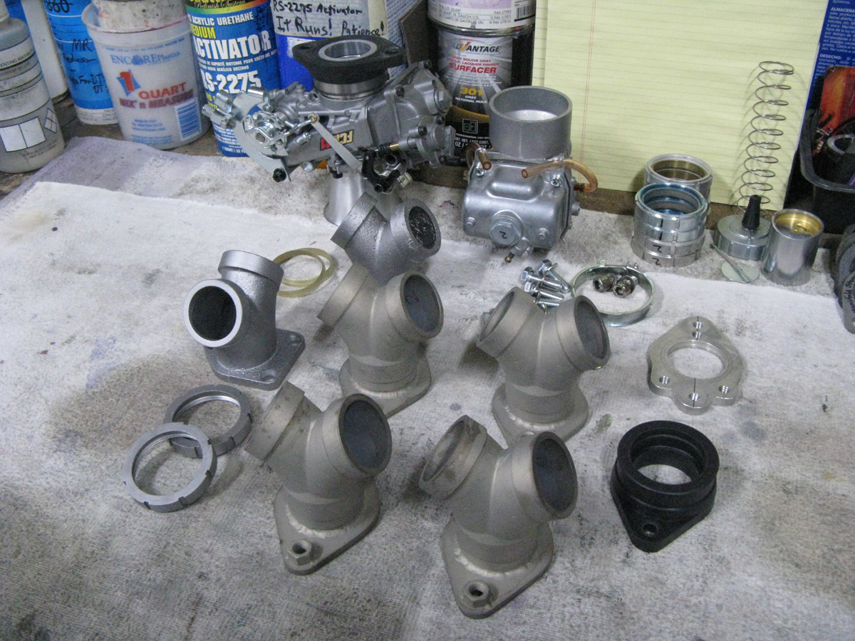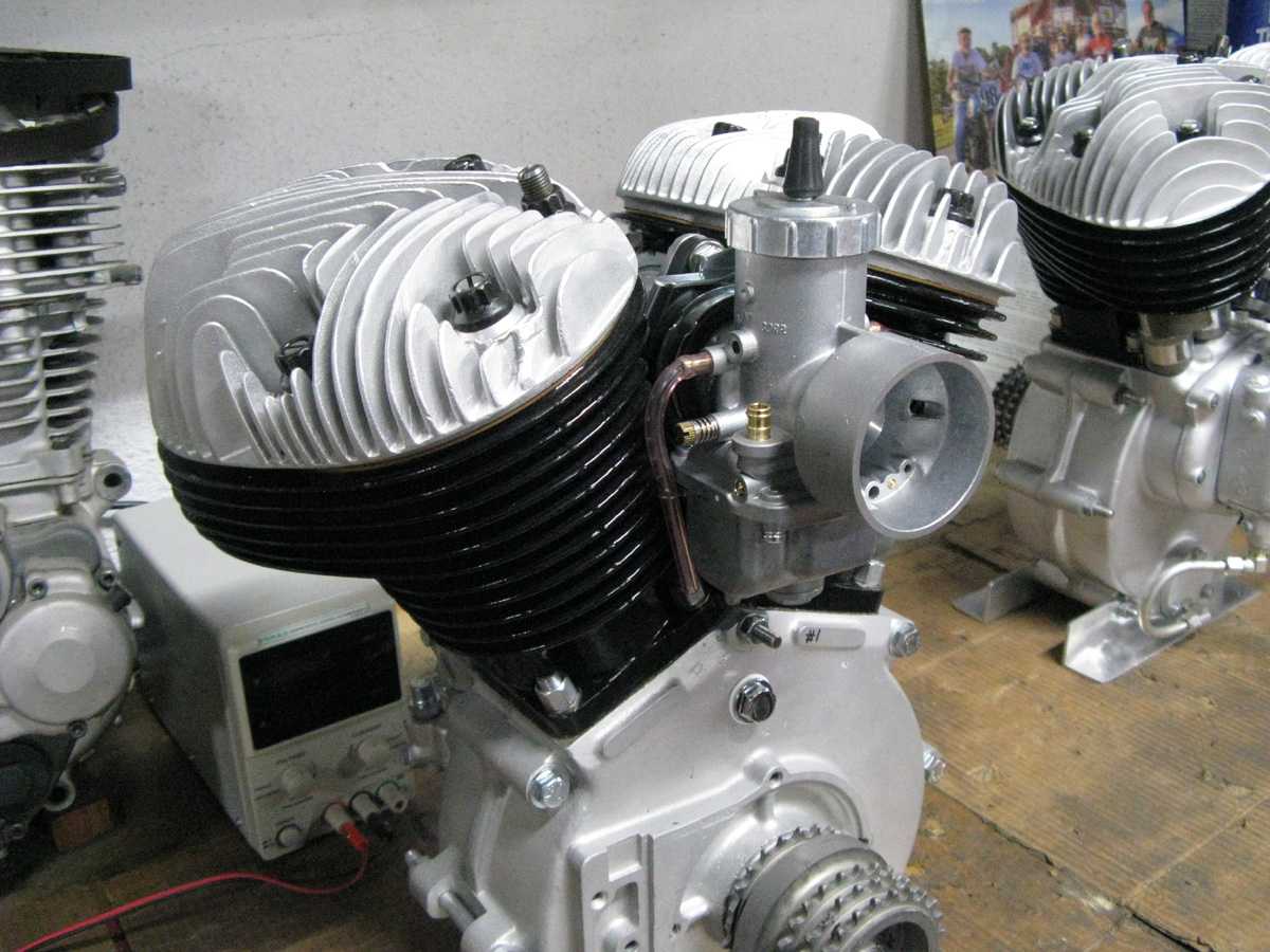 These motors have a real nice carb setup for performance, and reliability. They have Mikuni "VM36" round slide carbs that are the same ID as the manifolds. They work very well on these 58" Strokers! The manifolds are from Enfield Racing, cast in Bronze, and with a nice ported, and smooth inside. I added "2-bolt" plates to mount Mikuni rubber spigot mounts for the carbs. Then, I made carb support straps. This is a very nice setup.