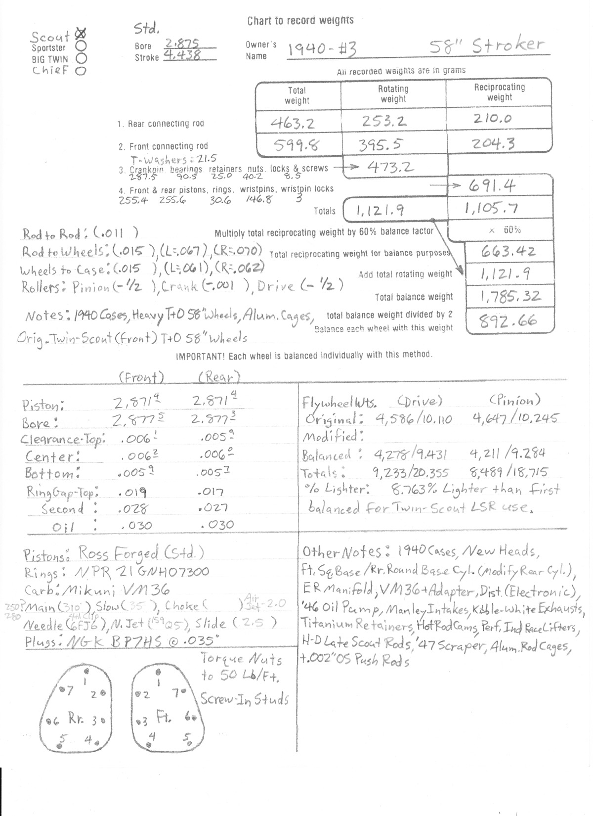 Here are (3) nearly identical Scout 58" Stroker motors. They are high-performance, yet fully streetable. I have built a few of these that have put on many thousands of miles, and still run strong. They don't leak, smoke, rattle, or get hot. These motors benefit from the many years of Land Speed racing Indian Scouts at Bonneville (successfully!). Every time I raced, and set records, I would do complete tear-down on the motors, and then do a forensic study to look for wear, so I could adjust the clearance specs to see if I see an improvement. I did at least (14) re-builds, and finally was satisfied with my wear patterns everywhere. These motors use all these final specs, and below, you can see a comprehensive spec sheet for each motor (Blue-Printed).