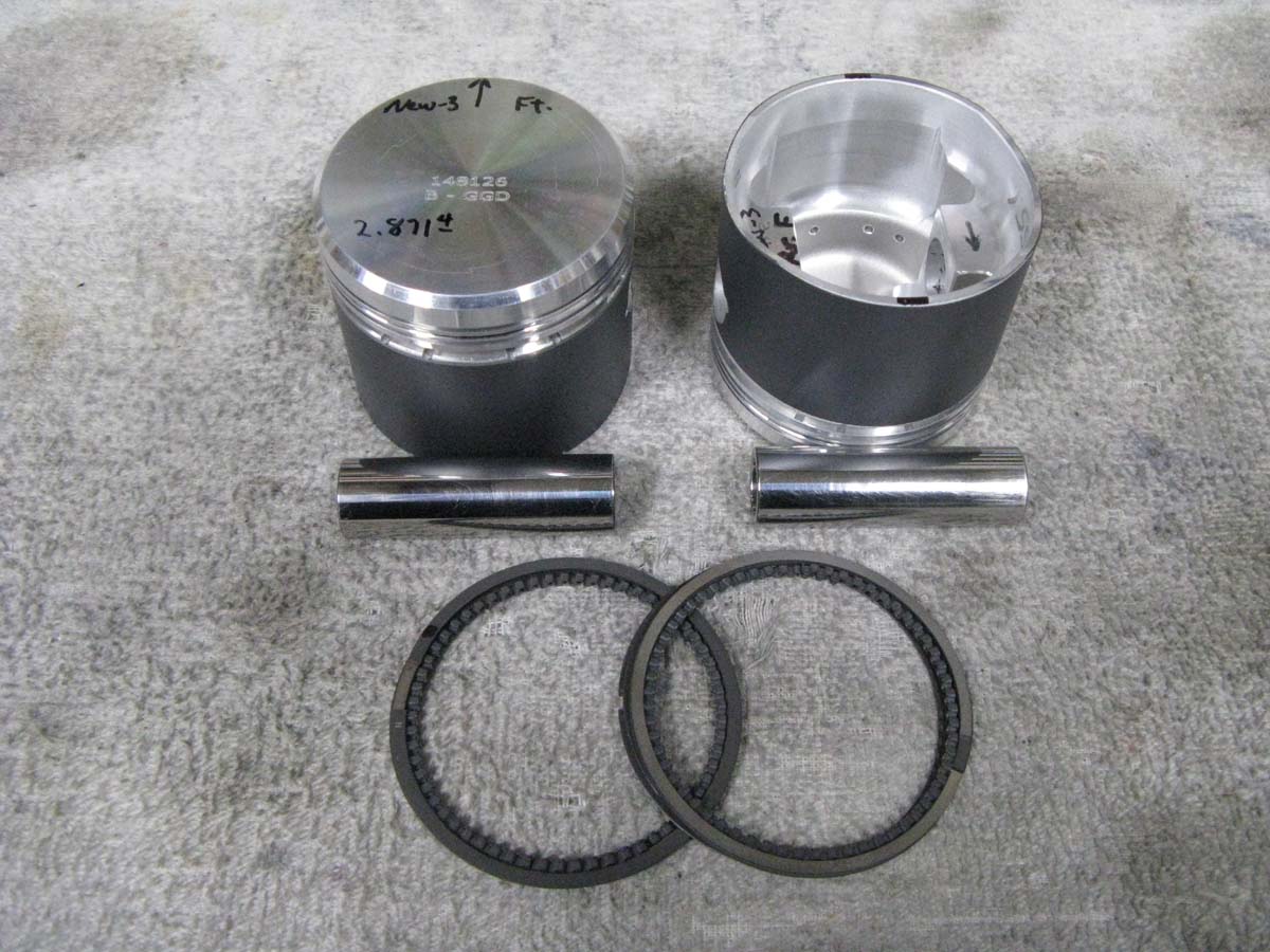 These motors have the late '40-'42 heavy duty rods. They are plenty strong. They have new lower races, and good upper bushings honed to fit. The pistons are "Ross Forged" pop-up pistons, with the pop-up of around .154". So, the heads are "Fly-cut" for clearance equal to the pop-up. Then, they use special copper head gaskets of .050" thickness. That give the motors a .050" "Squish" area above the piston. This is a good number for some extra power. They have very good "NPR" metric rings that are high tech, and light. The same as I race with for LSR records on Nitrous!