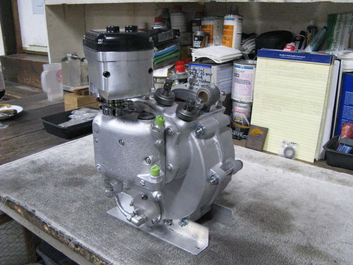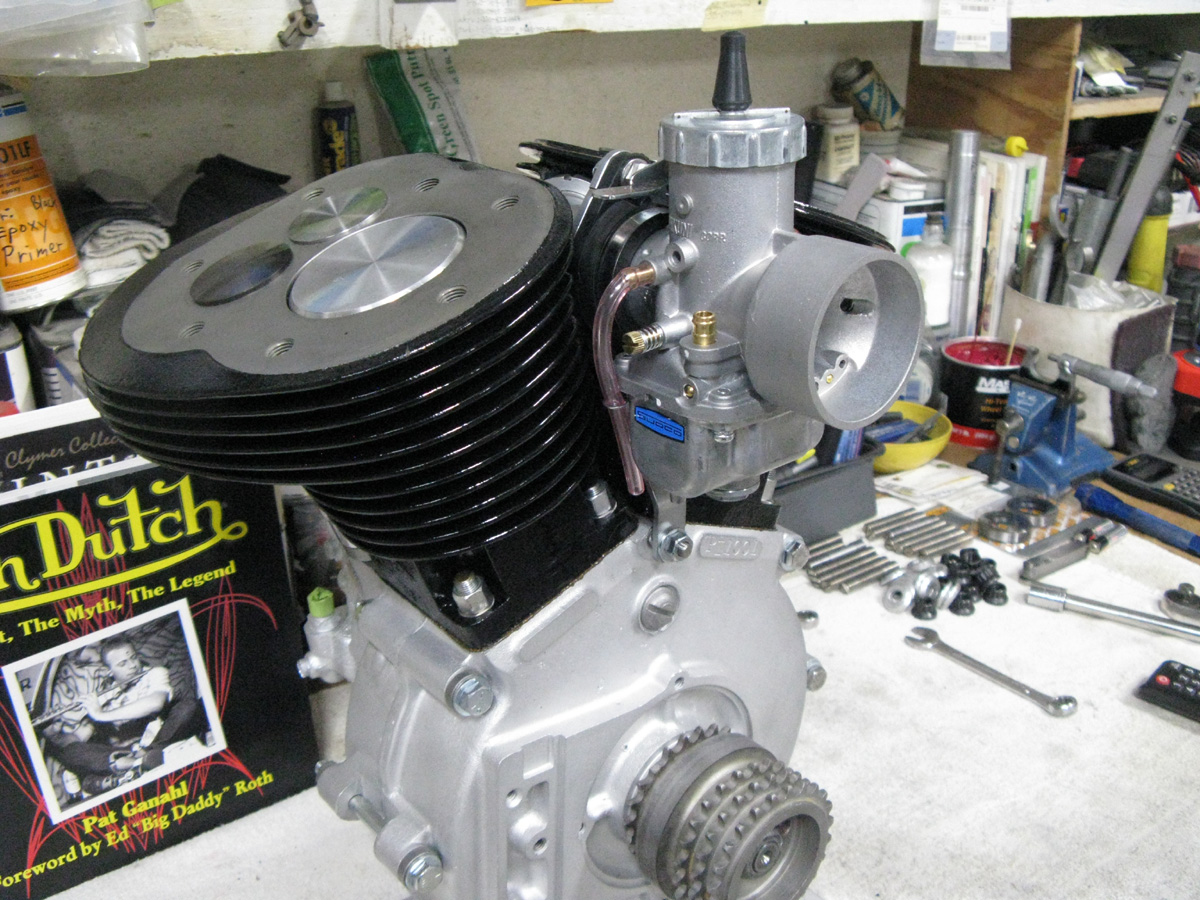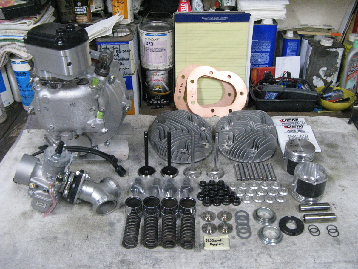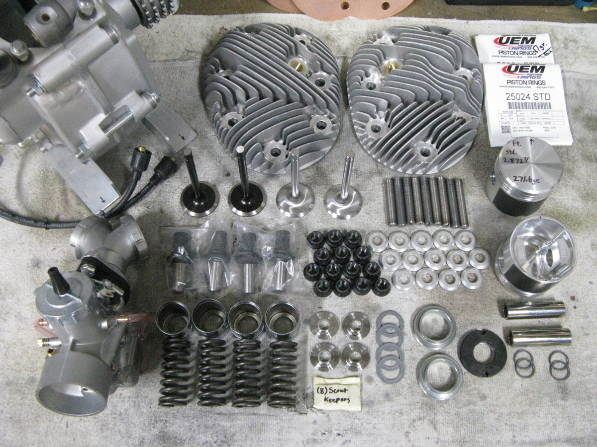 I added a set of new Scout heads from Jerry Greer's, and I fly-cut them to give a .050" squish. I then added a set of new cylinders from Enfield Racing. I detailed them, ported them, and added new intake nipples, and Starklite Valve guides. The guides were honed to fit, and Teflon intake seals have been added. I have a new performance intake manifold, and adapter for the Mikuni VM36 Round-Slide carb that works so very well with these Stroker motors. I have the new head studs, beveled washers, and ARP Grade-10, 12-point "Flange Nuts" that I use instead of head bolts. I have new valve guides, valve covers, 7-coil valve springs, Titanium Retainers, keepers, shims, and fiber washers to complete the cylinders. I also have new Manley severe duty Stainless Steel valves that I have made. I also have Kibble-White "Black Diamond" exhaust valves. When I got the cylinders, I did a porting job to enhance flow, installed the guides, honed the guides to fit the valves, and calculated for the correct valve spring tension. They got a "5-angle" racing valve job, and bored, and honed to suit the new "Low Expansion" Forged pistons (of my design). Then painted in high-gloss engine enamel. Ready to go!