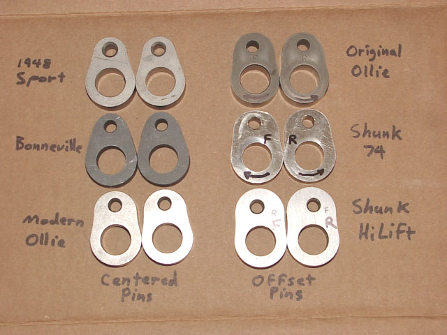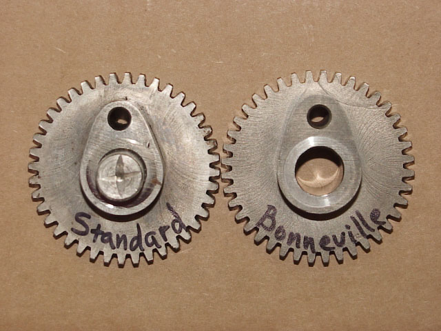 There are (2) factory installed cam/lifter combinations that were used, Standard, and Bonneville (Note: A little known fact is that in 1948, there were optional "Sport" cams available with standard lifters, and I have a set that I have measured, and they are also featured here). Standard cams are very tame, and as you all know, they "run out of steam" fairly quickly. This is because of their short lift, and very low duration. The factory came out with the Bonneville cam/lifter set to increase power, and RPM by increasing both the lift, and duration. The factory had to change the lifter configuration to accommodate the change in cam design. They moved the rollers closer in toward the pivot shaft by nearly .085", which moves the timing by roughly 10 degrees on the new Bonneville lifters. The Bonneville Exhaust lifter will "Retard" cam timing by 10 degrees, and the Bonneville Intake lifter will "Advance" cam timing by 10 degrees as compared to the Standard lifters. By moving the rollers inward on the Bonneville lifters, the rocker-arm ratio changes from .81:1 for Standard lifters to .86:1 for Bonneville lifters. These are approximate (but very close) figures, and the variations in shape of the "humps" that contact the bottom of the push rods can slightly change these figures. Therefore, on a given cam, a Bonneville lifter not only moves the opening, and closing points by 10 degrees, it will also slightly increase valve lift compared to a Standard lifter. This description of lifters holds true for the Scout Standard, as well as Scout Bonneville lifters, except that the Scout lifters are entirely different in design, and measurements. In fact, the lifter ratios for Scouts are lower than Chief at (.62:1), which required the cam lobes to be taller in Scouts than in Chiefs. Scout cams have been observed to be more "radical" than Chiefs, but that is mostly due to appearance. They need to look "Higher-Lift" because the rocker ratio is less, and therefore, there is less valve lift achieved from the same cam lobe in a Scout than if it were installed in a Chief. People have used Scout cam lobes in Chiefs with good success. I have a set of lobes here that I have measured that have been incorrectly named "Shunk Hi-Lift" that had been sold by Charlie Mathre for years, but recently it has been revealed to me that they were a Scout performance cam with the offset pin location incorrectly placed. They appear to be very Hi-Lift, because they were intended for use in Scouts with a lower rocker-ratio. They can be used in Chiefs with alot of changes being made to the valve spring setup, as well as "relieving" metal from above the valves in the heads. In a Chief, they turn out to be the most "radical" cam available.