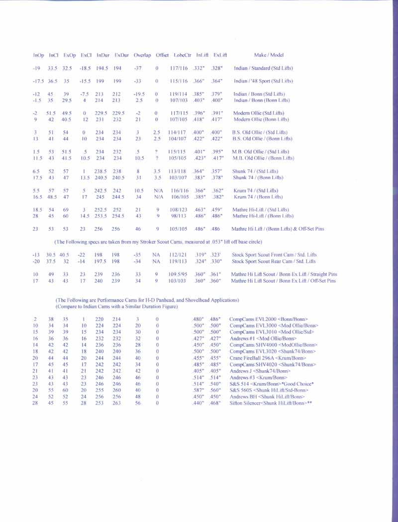 I found a handy source of H-D performance cam data at ( www.nightrider.com/biketech/HDMasterCamSpecs.pdf ). All of their measurements, as well as mine, were taken at .053" lift off of the cam's base circle. This is the accepted industry standard for measurement today, and my figures can be used for comparison against other grinds.