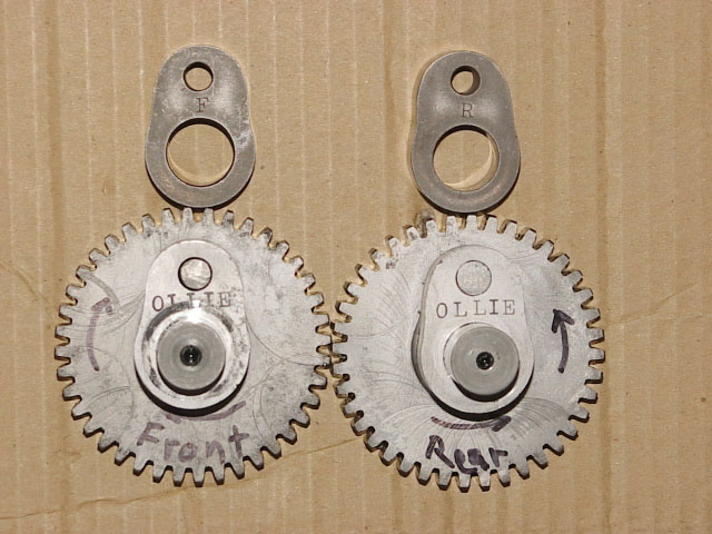 Some performance cam lobes have an offset pin location, where the cam lobe can be flipped over to either advance, or retard the lobe depending on how it is installed. All original Indian cams have a 1/4" hole drilled all the way through the lobe, and gear combo. I assume that it was to index the cam lobe for cutting in the gear teeth. This 1/4" hole is used to "pin" the new lobe to the gear after the original lobe is ground off. In most cases, I have measured a width of 1.125" width of the original gear, and lobe combo (.880" for Scouts). The new lobes can varry in width, so the amount of the original lobe to be ground off is exactly equal to the width of the new lobe that is going to be pressed on. Adjustments can be made to this net width to add or remove material in order to achieve the factory recommended .004" to .006" side play of the cams in the timing chest. After the cam lobes are lined up well, and pressed on, a .250" shaft (1.250" long) is pushed through the 1/4" hole, and staked over to lock the cam lobes in place. This is a very difficult job that is best left to the professionals! On some cam lobes, this 1/4" hole is centered, and therefore, a lobe can be flipped over, or used on either the front, or rear cylinders. You can't get them on wrong! These are the Bonneville, the commonly known "Ollie" lobes, and the 1948 "Sport" lobes. The next (5) sets I describe here all have pin holes offset to the side slightly. 1&2)The recently developed cams that Terry Krum provides are virtually the same lobe as an old set of lobes that I borrowed from Bob Stark's cam collection that are labeled as "Shunk 74". 3&4) I have an original set of cam lobes from Mike Breeding's collection that are stamped "Ollie" that appear to be identical to a set I borrowed from Bob Stark, but they do not appear at all similar to the modern "Ollies" that are available today. 5) The last set here are the before-mentioned "Shunk Hi-Lift" cams that were originally intended for Scouts, but the pin hole was located in the wrong place. They were drilled for a Chief cam gear, which explains the very high lift when used in a Chief. All of these (5) have offset pin holes, and weather installed on the front, or Rear cam, the lobes can be installed in their direction of rotation as advanced, or retarded. As example, the front cam as viewed from the cam lobe side rotates in a clockwise direction. With the lobe pointing upwards, the pin location should appear to be to the left of center if the lobe is desired to be advanced (to the right of center if retarded). Use some logic here! As the lobe rotates, there is a "meatier" portion of the lobe to one side of the pin location, and if it is ahead of the pin as it rotates, then the lobe is advanced. There has been alot of controversy about these offset pin locations, and their intentions. Charlie Mathre marketed his "Shunk Hi-Lift" lobes with instruction that specified that the lobes be installed in their "Retarded" position. I had long discussions with him on this, and we both are convinced that the other guy is wrong. These cams have the pin location at 9 degrees off center, so there is a difference of 18 degrees of timing (Retarded) if the lobes are installed the wrong way. Bob Stark and I had a long talk about this, and we both agree that all offset lobes should be advanced, so the intake valve will close sooner than later allowing for more compression to build on the compression stroke. Bob Stark even pulled out an original set of "Shunk" lobes where the front cam lobe was installed advanced, and the rear cam lobe was installed retarded. They were both stamped "Shunk" on their face. They might have installed a front cam lobe on the front, as well as the rear. They might have incorrectly installed the rear cam lobe, and then stamped them. Regardles, this combination was not correct in any case. Only one of the cam lobes was on correctly. Which one? I also have a set of cams that I recently removed from Mike Breeding's "Yellow Dog". They are stamped "Ollie" on both lobes, and they are in the retarded position. I have a pair of lobes from Bob Stark's collection that look identical to these in a bag labeled "Ollie", and they are stamped "F", and "R". If these were installed with "F" on the front cam, etc., they would be in the advanced position. Which way is correct? My job here is to measure the pin offsets, and then the data can be looked at and compared to known profiles for comparable applications. Idealy, in my opinion, we need to come close to the accepted figures for other popular cams, and using lobes that are retarded (as well as using Standard lifters) take us farther away from the ideal opening and closing figures. I have measured the data for these cams in their advanced state, and I am showing the pin offset in degrees. Flipping the cam lobe over will retard the same cam measurements by twice the number of offset degrees! The Shunk Hi-Lifts have a 9 degree offset ( 18 degrees if flipped, equalling (1) gear tooth), and if retarded, the intake valve won't close untill the piston is more than half way up it's compression stroke!