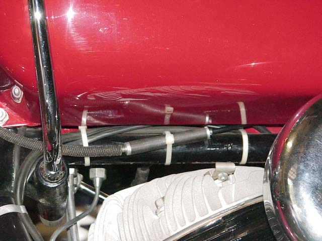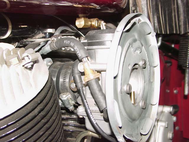 Included is a throttle cable adapter, which converts the original solid wire type cable to a modern flexible cable for the new carb. The original outer cable jacket must be shortened some. First remove the throttle grip, and pull out the center wire. Remove the outer jacket from the clamp on the front head's head bolt. Measure 5 inches from the edge of the clamp at the gas tanks front/lower mounting bolt, and cut it with heavy cutters. Grind, or file the end nice and flush. Re-install the inner wire, and fully install the twist grip. Roll the throttle to the full "Off" position, and pull out any extra slack on the inner cable with pliers. Measure exactly 2 1/4" from the outer jacket edge, and cut the inner wire. Note: I have seen (and presently use) throttle grip spirals that have a looser spiral pitch, that pull the cable farther for a given number of degrees of throttle rotation. I don't know the whole story yet on these different types, but I prefer the looser pitch, because they make more of a "Quick Throttle" feel. A quick throttle is a little harder to pull, but makes the bike feel more powerful. More of a psychological advantage! The throttle grip, and the cables must be in perfect working order, and lubed well with grease, because now the cable must pull open a carb against a return spring, and sometimes, a little drag on the cable will cause the twist grip to jam-up. It takes some work to get this right, but it certainly can be done.