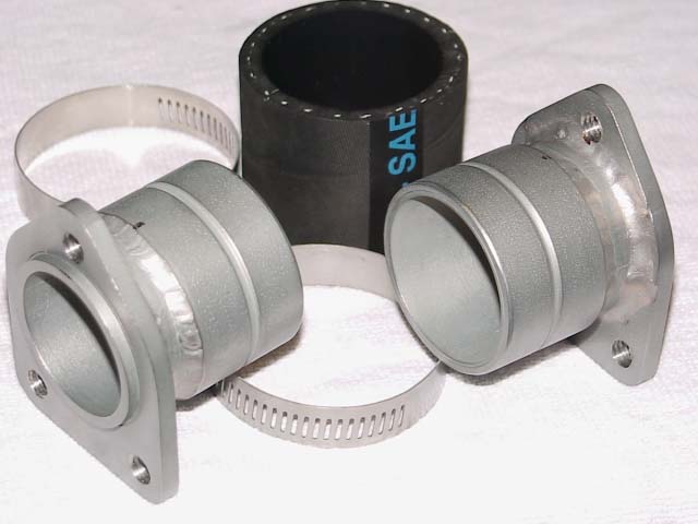 I found a rubber tubing that is used as boat exhaust that is plyable, resists heat, fuel, and oil. Two common 2 1/4" heavy duty hose clamps are used. Fully push the tube onto the carb, and clamp tight. Then fully push the tube over the manifold until the carb meets the manifold, and clamp tight. I like to use a press to gently push the manifold adapter against the carb, then tighten the clamps. I position the clamp screw heads at the 5 O'clock position with the screw end pointing downward.