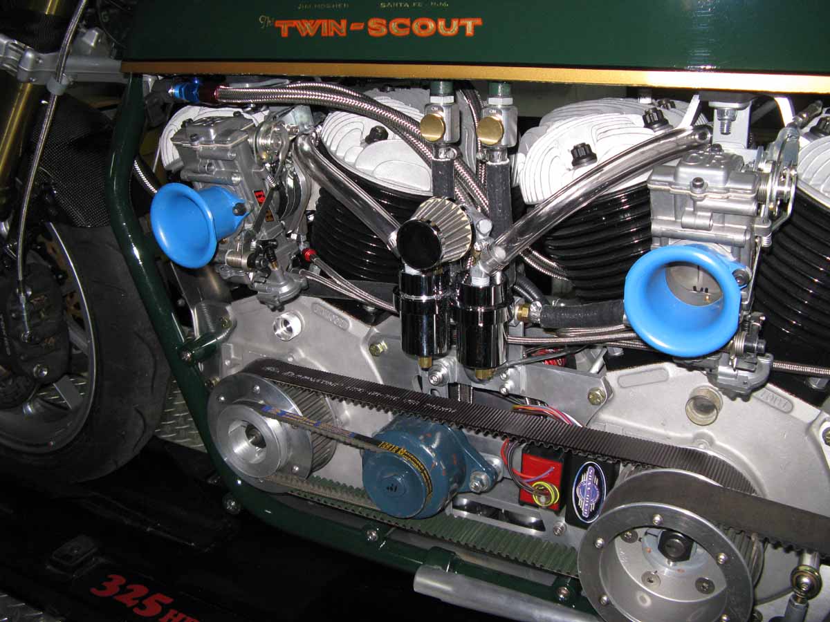 What you see here are a pair of Keihin 41mm FCR "Flat Slides". This is the very best carb ever built for a motorcycle. They are for big bore racing dirt bikes, and also Super-Bikes. They come in the following sizes:33mm, 35mm, 37mm, 39mm, and 41mm. The 39mm's are spec'd for Sportsters, while the 41mm is spec'd for Big Twin H-D's. I chose (2) of the 41mm's for my Twin-Scout, and they work flawlessly. They have an accelerator pump, and chokes. They are high tech, with alot of options, like air cleaner/air box mounts or velocity stacks. They have interchangeable outlets, so you can adapt them to various sized manifolds. They are not cheap at around $900.00 retail, but there is no better carb anywhere! On our Bonneville Land Speed racing Norton 873, I swapped out (2) Amal Mk2 36's for (2) Keihin FCR 39mm's, and we picked up 20 rear wheel HP!