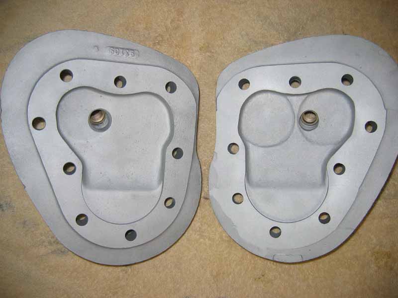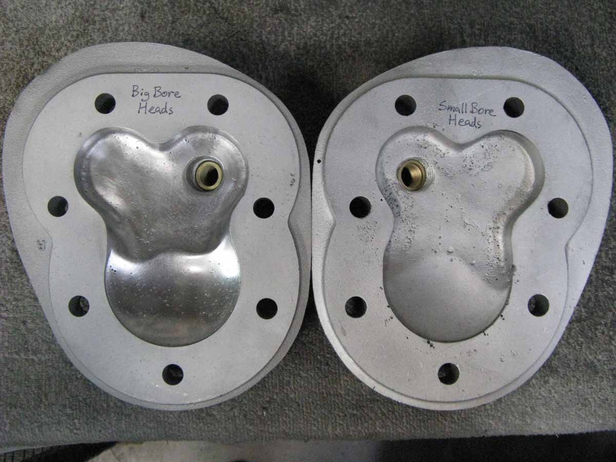 The head on the left is not yet "Relieved". The head on the right has been highly relieved for .486" lift cams, and this head has been milled ALOT! Notice how I smoothed the edge where the chamber rounds over above the cylinder. These are on my "Super Chief" 80" motor.
