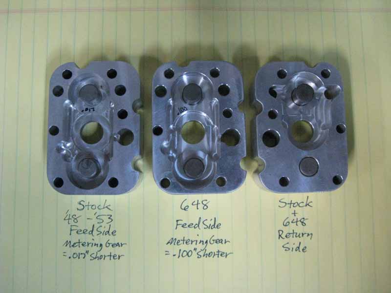 Bob Stark has attempted to improve the performance of an aluminum pump by making a new gear set that uses 12 tooth "driven" gears (instead of 13), while the "driving" gears are still (13) teeth. The (12) tooth gears will spin faster, and 8 1/3% more rotation than the driving gears. There are larger voids between the teeth to carry more oil as well. They claim a 30% increase in flow, which is about the same as a plunger pump. He calls them the "Viagra" gear set!