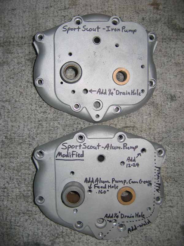 The aluminum pump is a very different pump. My opinion is that the iron pump is a better pump. The aluminum pump came out in 1948, and was used up to the end of production. In 1948, it was also used on the 648 "Big Base" Scout racers. The are two differences with the 648 pump. First, the oil lines mounted on the outer side surface, and ran rearwards to the oil tank under the seat. The second mod was done to the 3rd "metering" gear used in the set of feed gears. A stock pump's metering gear is .017" thinner than the other two feed gears, while the 648 pump's metering gear is .100" thinner than the other two gears. The 648 pump is supposed to flow alot more oil. I will soon see first hand, since I am adding the 648 pump bodies to my Twin-Scout. The aluminum pump is not a "plunger" pump, but rather a rotary geared pump that has a steady flow of oil (with un-impressive flow).