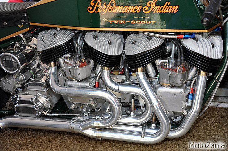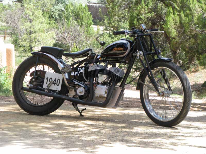 I have a dyno with an "air/fuel" sniffer, and I use it alot to test performance modifications. I did a long study on Indian exhaust systems on the Scout Land Speed racer pictured below. The first time I crewed for this bike, he had a long 2-into-1 straight pipe. I thought that "Duals" would be better. At Bonneville we were making some consistant runs on the 2-into-1, and switched over to the duals. We lost 10 MPH! After going back to the 2-into-1's we picked our speeds back up. I decided to do a comprehensive test. I made tail-pipe sections in 6" lengths that I could stack together to play with lengths. We used basically a stock front header (1 5/8" OD), with a 1 5/8" straight tail-pipe. I tried (4) different lengths. The shortest was about 6" further than the rear of the front header. It made a little more peak power, but suffered alot of torque. The longest tail-pipe made the most torque, and lost only a little peak power. The longest tail-pipe made a very broad torque curve. This pipe came all the way back to the rear of the rear tire. As I shortened the tail-pipe, I found the peak power pick up a little more power, without losing much torque. The best power combo for our needs was found with the tail-pipe ending 6" from the rear of the rear tire.