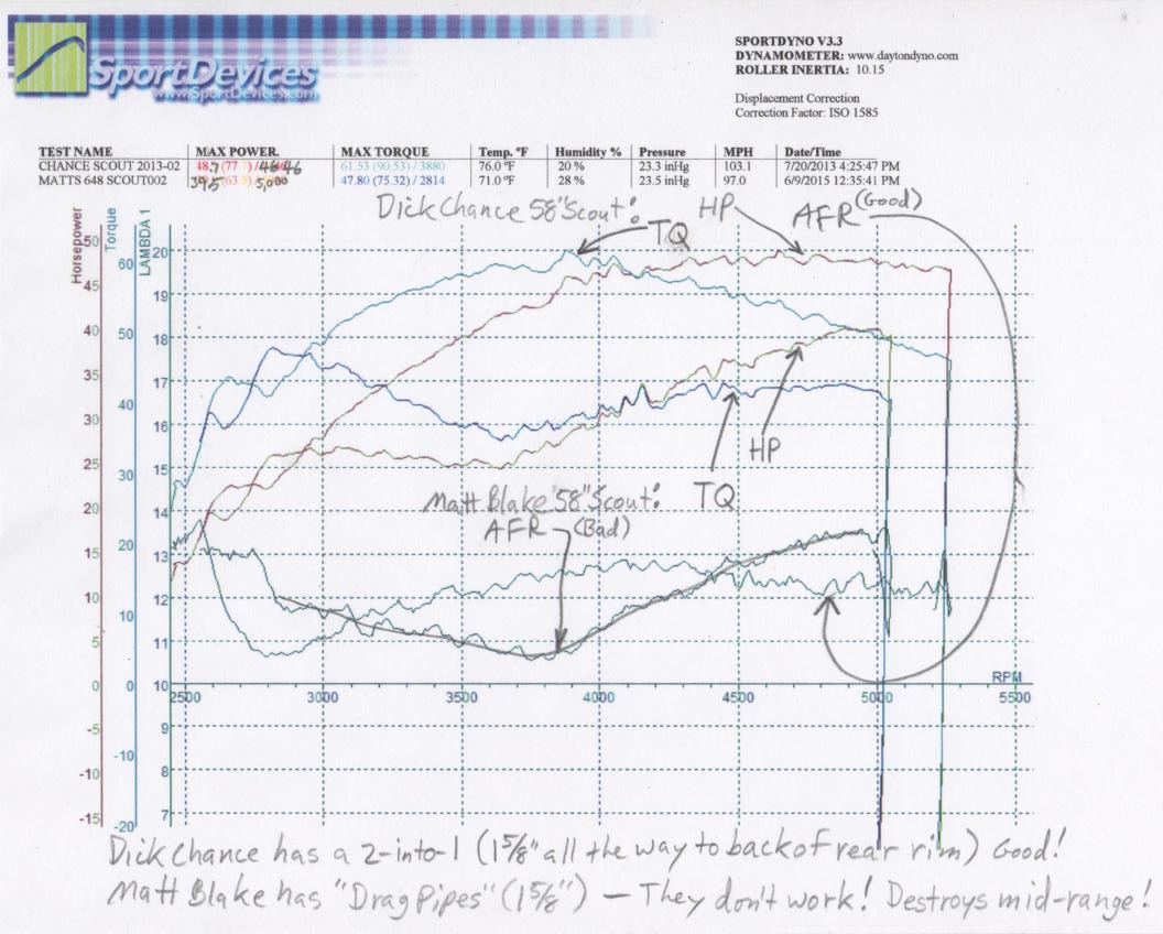 I built (2) 58" Scout "Stroker" performance motors for (2) of my friends. One has "648" Big Base cases, while the other was stock Sport Scout cases. I used the same cams and lifters in each (my racing lifters, and my Street and Strip) cams. They had the same pop-up "Arias" forged pistons, and the same porting. They both used the same Mikuni VM36 carbs, and magnetos. The only difference was in the pipe setup. Dick Chance's LSR bike used a "2-into-1" system using the stock front header (with the rear pipe weld joint cleaned out for better breathing). I extended a 1 5/8" tail-pipe all the way back to the rear tire. It ended with a slash-cut end. Matt Blake chose to use Bob Stark's chromed "Drag Pipes" (what a drag!). The dyno chart below shows both bikes best dyno runs shown together, so you can see the power difference. At mid range, the drag pipe's power fell off to roughly 1/2 of the power from the "2-into-1" system. You can clearly see that at just over 3,500 RPM, Matt's motor has lost "half" of it's power. They make the same power at low RPM, and less power at high RPM, but the mid-range is destroyed! The reason is because the pipe's wave reflex action is all wrong due to the short pipe lengths. That happens at 60-65 MPH, where you are looking for power to pass, or good power for having some fun. Note: Dick Chance's bike has real high gearing for Bonneville, and if it had the same as Matt's street bike, then Dick's bike would show even more power on this dyno chart! Take a look at the dyno chart below. All the data is there.