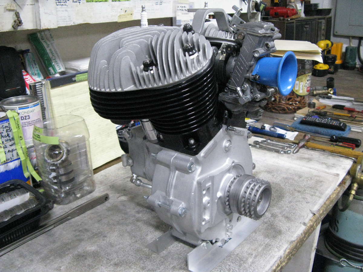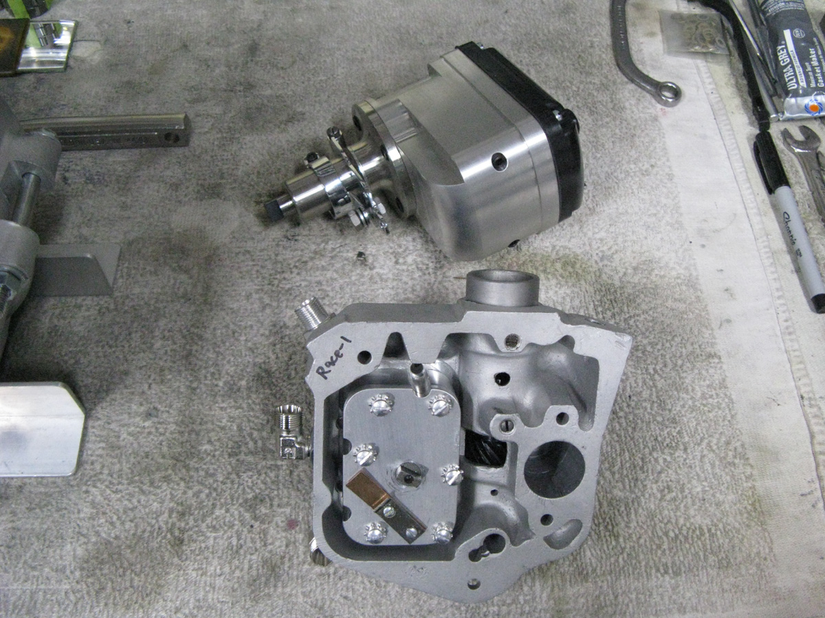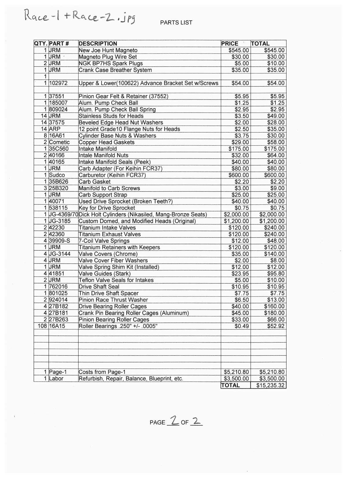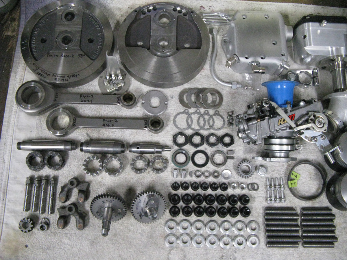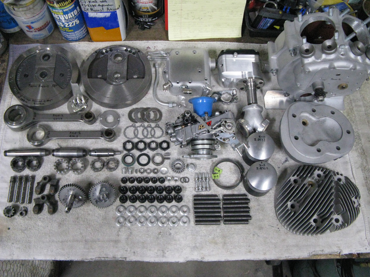 I picked a Keihin "FCR41" carb for these motors to race in the big motor configuration, but these motors are equipped with the smaller Keihin "FCR37" carbs that I ran in the small 45" motor classes. For street, these are a better choice, and will offer excellent throttle response, and plenty of power. I use the original intake manifolds with a custom carb adapter, that I ported for performance. These will flow a lot better than any other choice! At first, I had Morris Magneto build me some very hot Magnetos, but they created too much rotational drag, and I had a hard time keeping them from twisting themselves out of the oil pumps. So, I switched over to original distributors with hot coils, and pointless ignition modules from then on. These motors have new "Joe Hunt" magnetos with a good reputation. I like to "Lock" the mags at 30 degrees BTDC (no advance/retard). I would do a stock front header with a long 1 5/8" tail-pipe all the way to the back of the rear tire for best performance (NO drag pipes!).