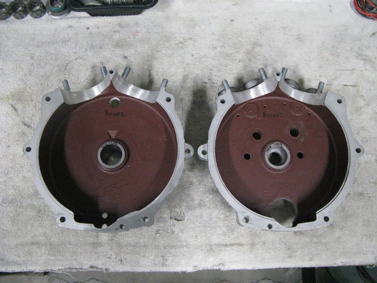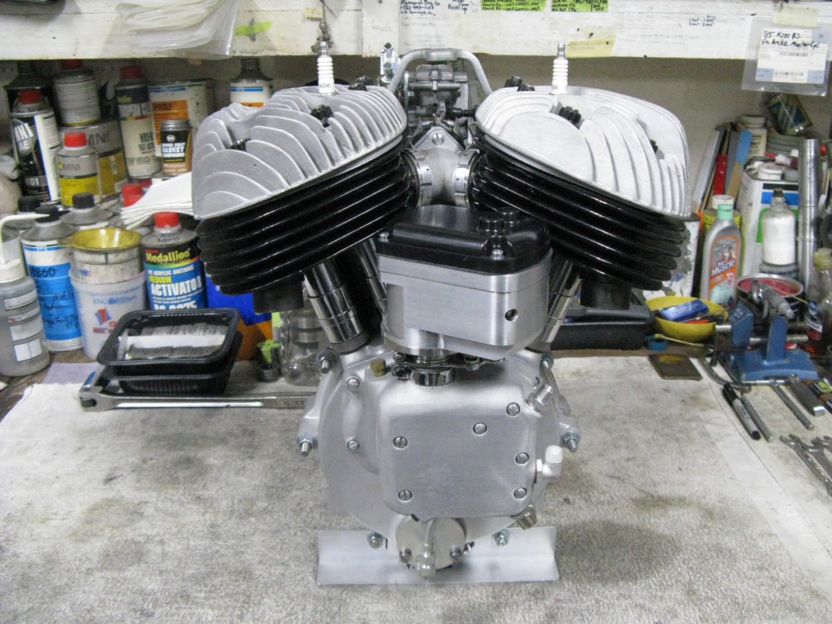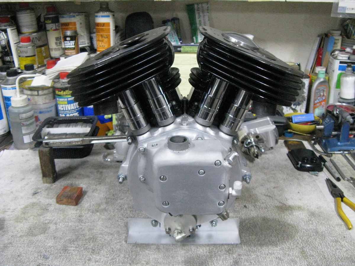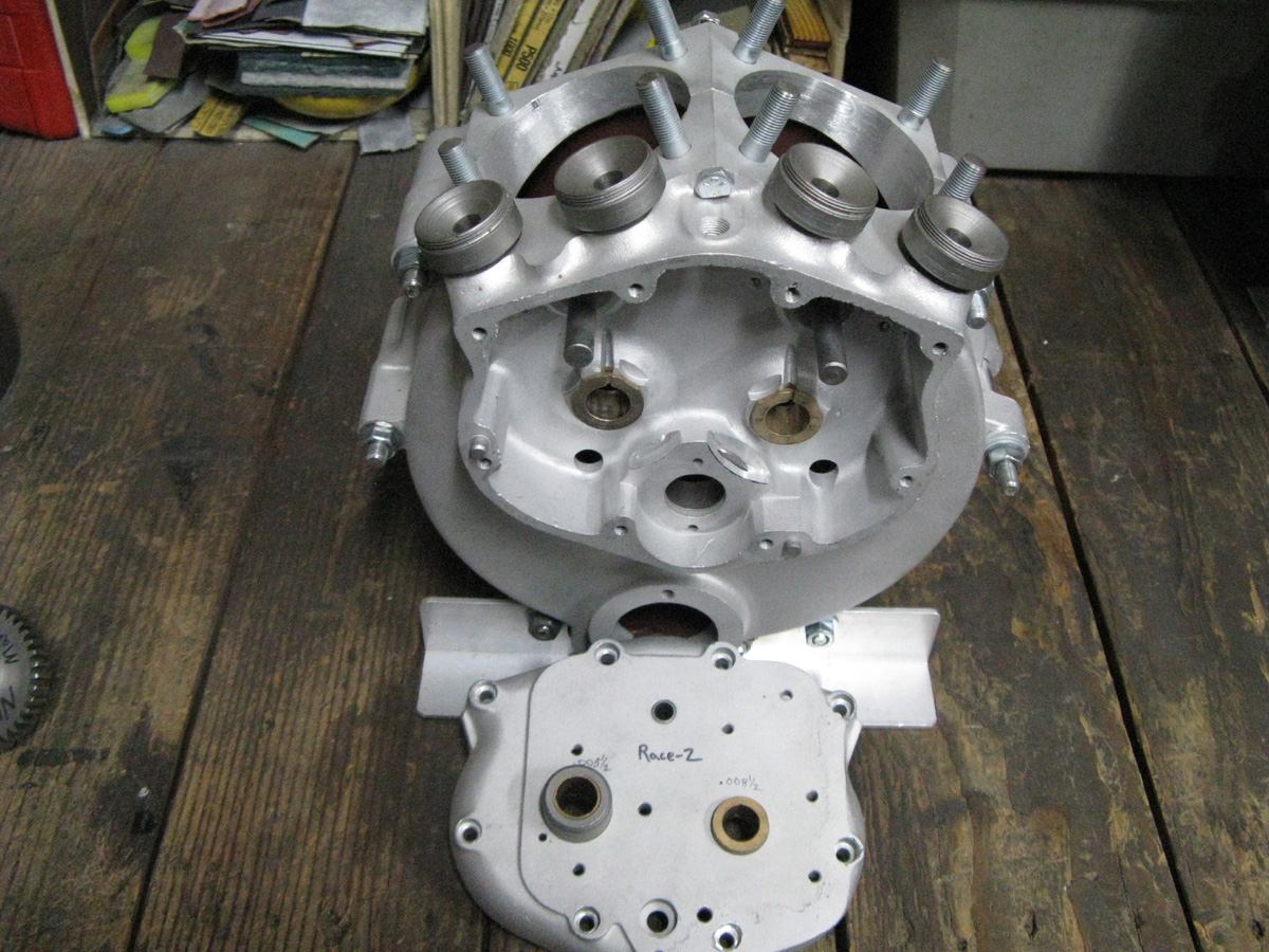 Of these (3) motors in the pic above, the one in the middle is "Race #1", one of the "Series One" race motors from My Twin-Scout Land Speed Racer (the front motor). The motor on the left is Race #2, or the rear motor. These (2) motors are identical clones, with just slightly different measured internal dimensions. I did a seperate page for each motor, so you can see the individual spec sheets for each motor. Otherwise, the individual parts costs, and total costs are the same for each motor. I have over $20,000.00 invested in each motor, with a lot of custom made parts, and outside services. So, yes, I am taking a loss here. But, they got the job done for me in shining glory! They have set (10) new Land Speed Records in the "Altered Vintage" classes. I built the chassis as a platform to run these motors as both 45", 58", and 62.5" motor sizes. There were (4) new records set with my "Series Two" motors that are 62.5" at plus .100" overbore, and the long 4 7/16" stroke. Later, with these motors, I added my 45" flywheels, and 45" domed pistons to go for the "1,000cc Altered Vintage" class records using these parts. These cases, are replacement "741" cases, because the original cases are still in the bike, because they have been altered in the motor mounts. Otherwise, they are identical very good cases. I prefer the "741" cases, because they have the timing hole on the left case side (otherwise they are identical to Sport Scout cases).