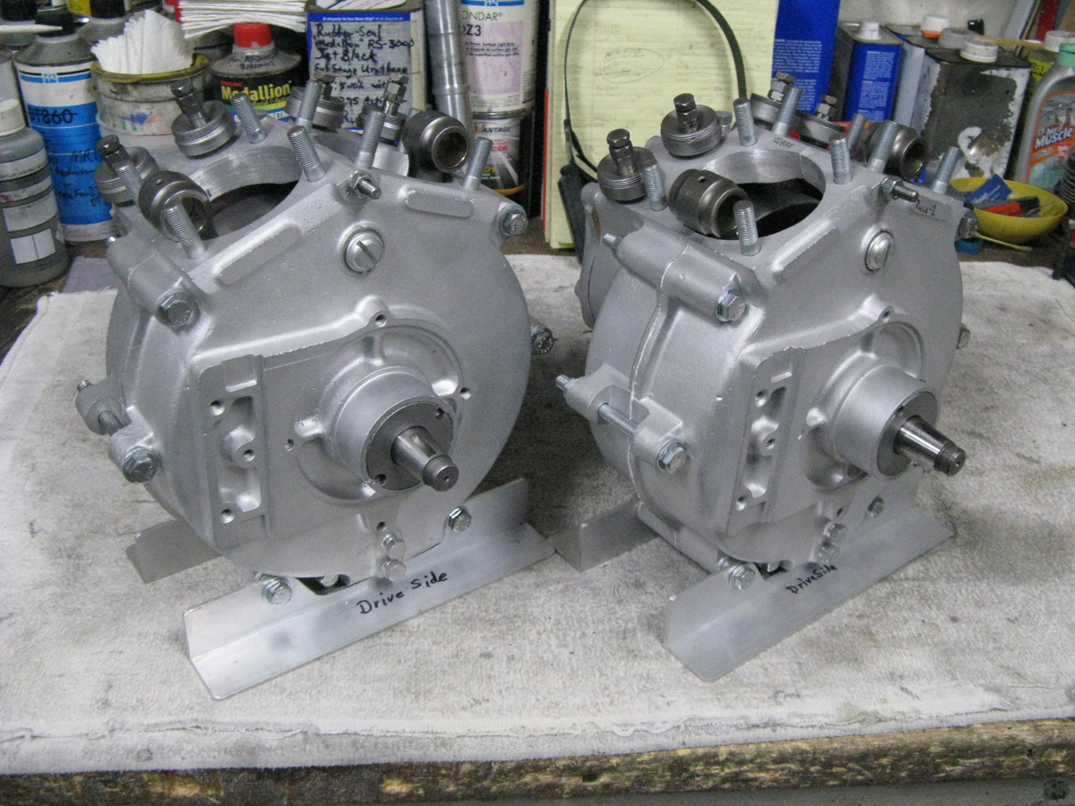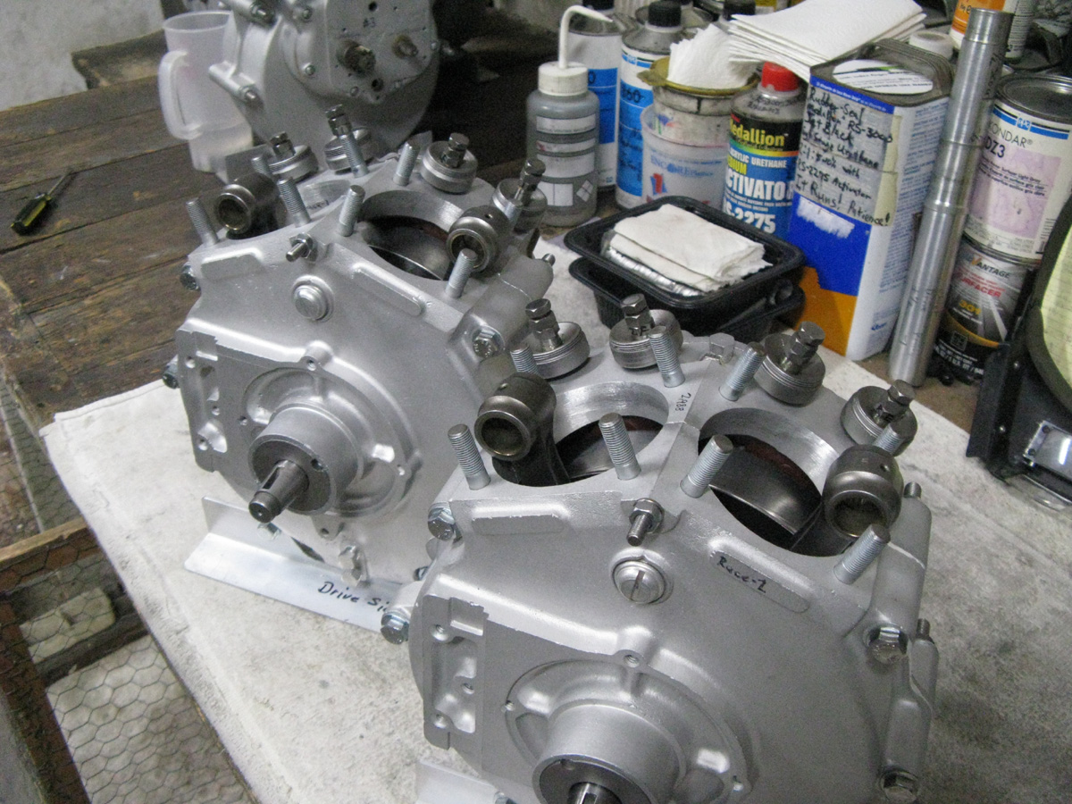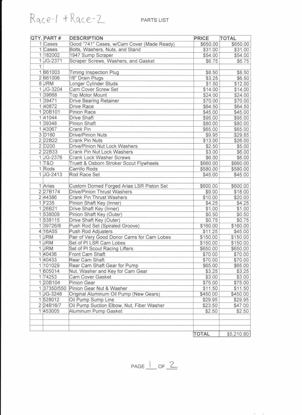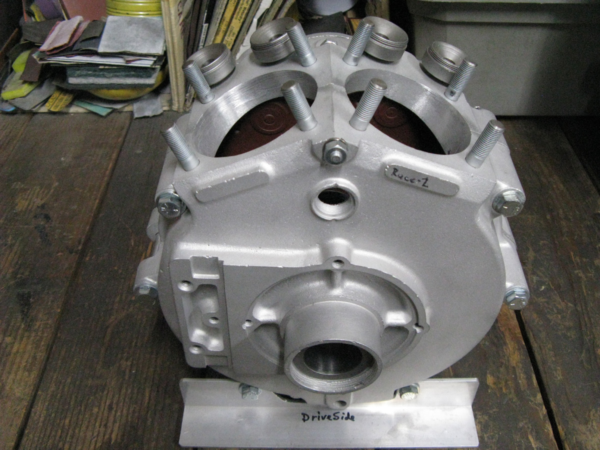 Of these (3) motors in the pic above, the one in the middle is "Race #1", one of the "Series One" race motors from My Twin-Scout Land Speed Racer (the front motor). The motor on the left is Race #2, or the rear motor. These (2) motors are identical clones, with just slightly different measured internal dimensions. I did a seperate page for each motor, so you can see the individual spec sheets for each motor. Otherwise, the individual parts costs, and total costs are the same for each motor. I have over $20,000.00 invested in each motor, with a lot of custom made parts, and outside services. So, yes, I am taking a loss here. But, they got the job done for me in shining glory! They have set (10) new Land Speed Records in the "Altered Vintage" classes. I built the chassis as a platform to run these motors as both 45", 58", and 62.5" motor sizes. There were (4) new records set with my "Series Two" motors that are 62.5" at plus .100" overbore, and the long 4 7/16" stroke. Later, with these motors, I added my 45" flywheels, and 45" domed pistons to go for the "1,000cc Altered Vintage" class records using these parts. These cases, are replacement "741" cases, because the original cases are still in the bike, because they have been altered in the motor mounts. Otherwise, they are identical very good cases. I prefer the "741" cases, because they have the timing hole on the left case side (otherwise they are identical to Sport Scout cases).